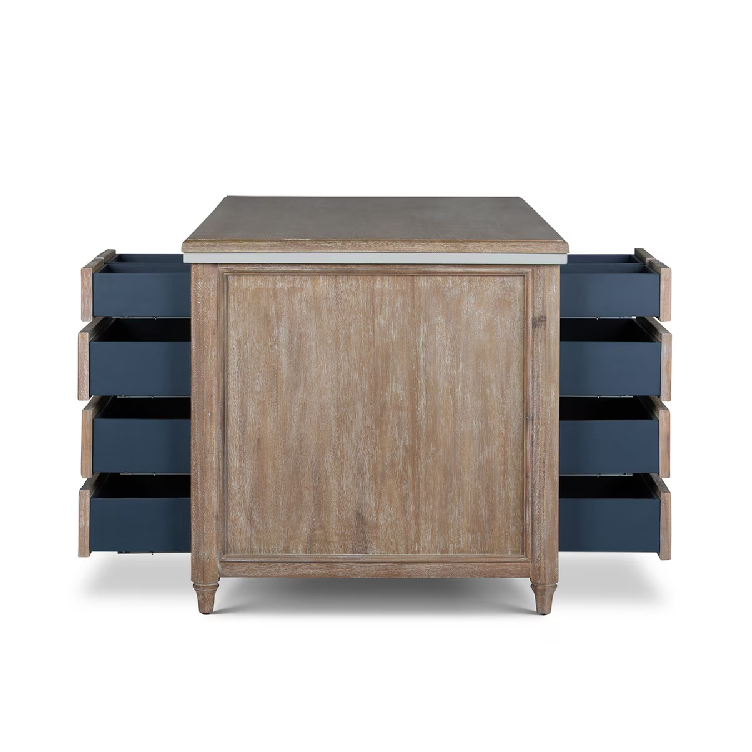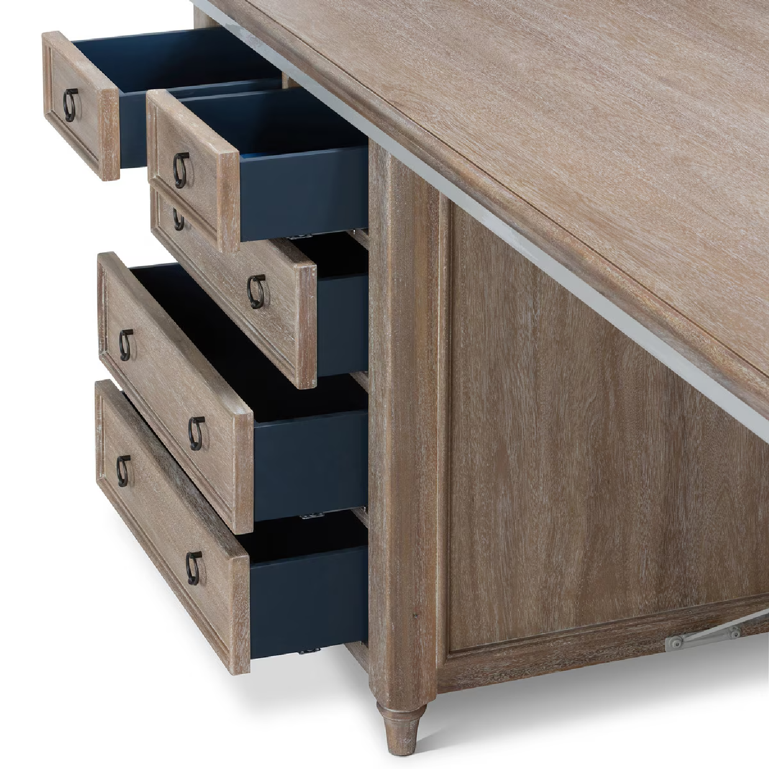 Driftwood with Khaki powder-coated trim.  Reflective of our approach to functional furniture that feels purposeful, balanced, and enduring, the Studio Partners Desk is equally suited to home offices, creative studios, kitchens and shared workspaces.  Each Studio Partners Desk is equipped with Park Hill Collection's blue felt-lined top drawers combined with soft-close drawer glides.