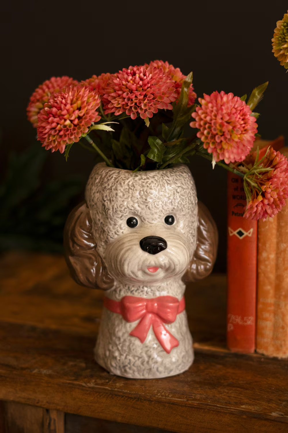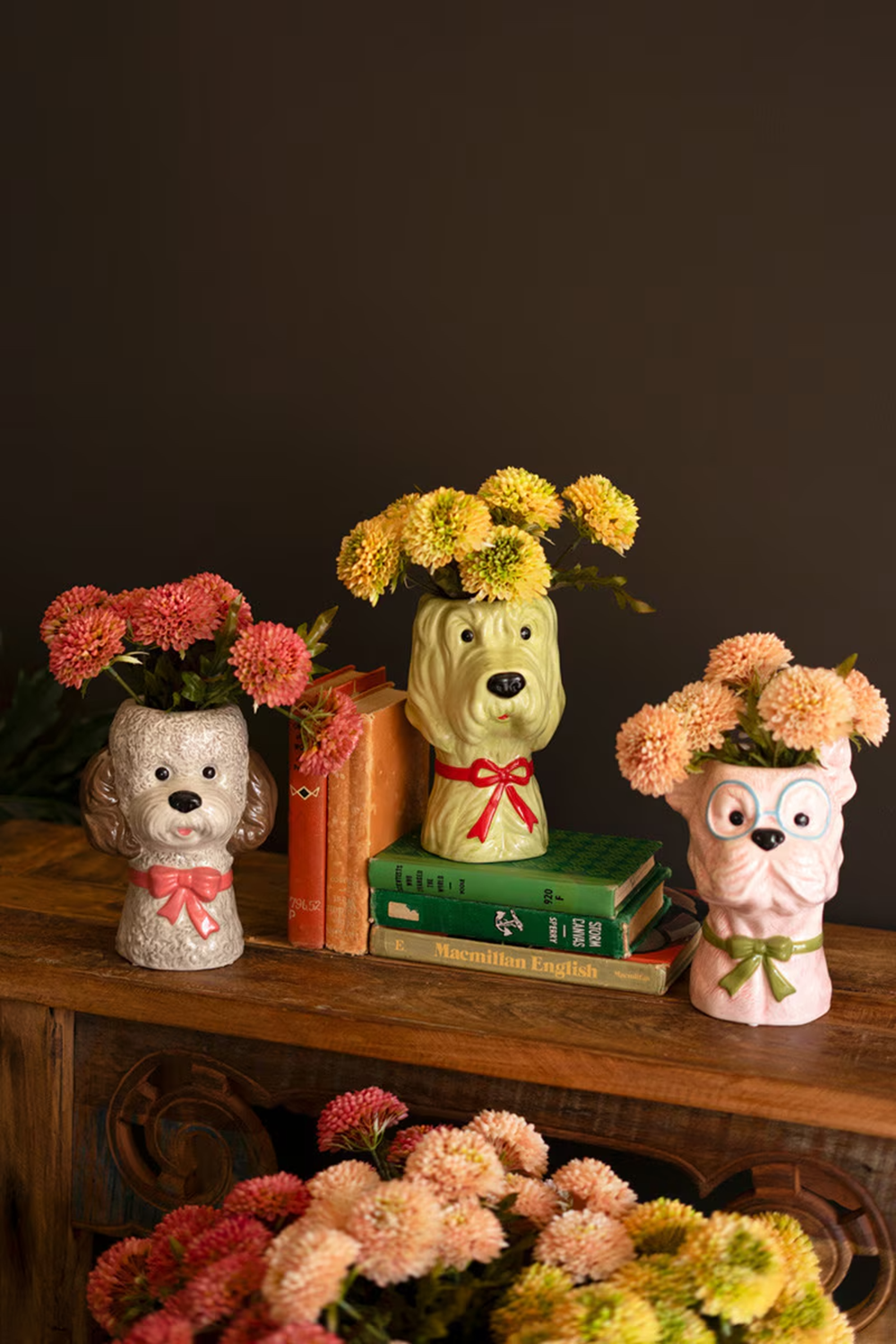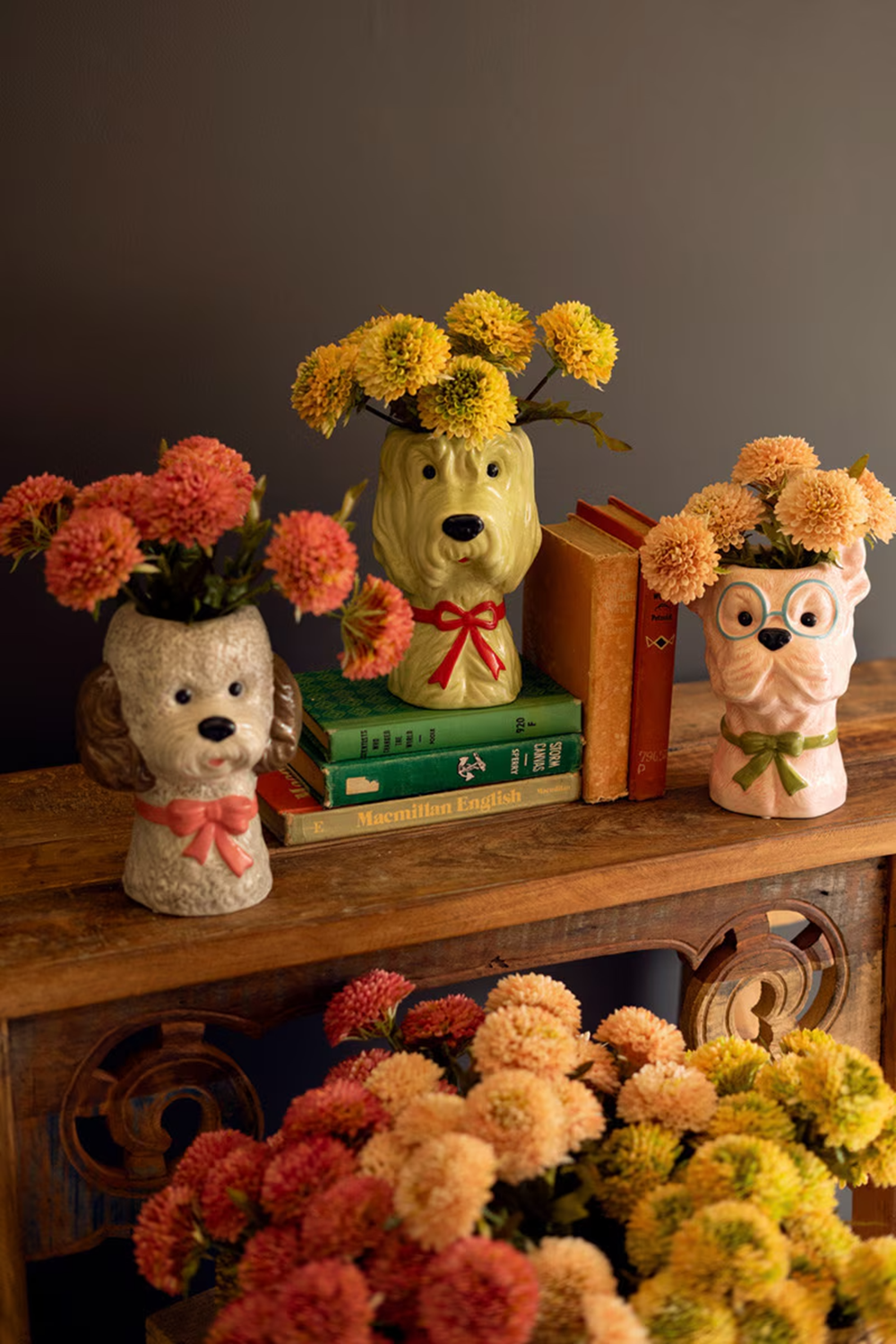 These pups are ready to fetch some smiles. With bright colors and friendly faces, they bring a joyful pop to your florals. Style them together for a tail-wagging trio or let each pup claim a favorite spot. Either way, they bring a whole lot of pawsitive charm to your home! Finished on all sides. Rubber feet. No drain hole. Set includes 3 pieces- one of each style.
