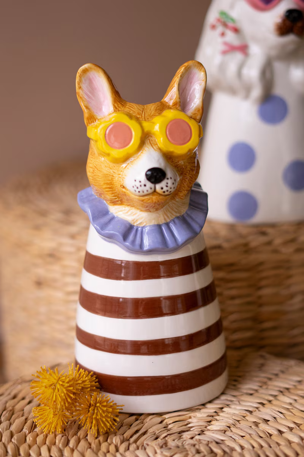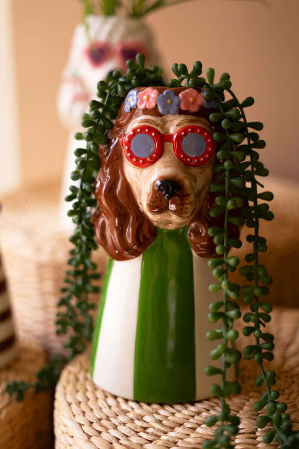These sun-shaded pups are ready to brighten your day with their cool, laid back style. Each dog brings its own splash of color and personality, making your florals look instantly paw-some! Group them together for a trio that really brings the sunshine, or let them sit in their own favorite spots. Either way, they add a cheerful dose of doggone fun to your decor! Finished on all sides. Rubber feet. No drain hole. Set includes 3 pieces- one of each style.