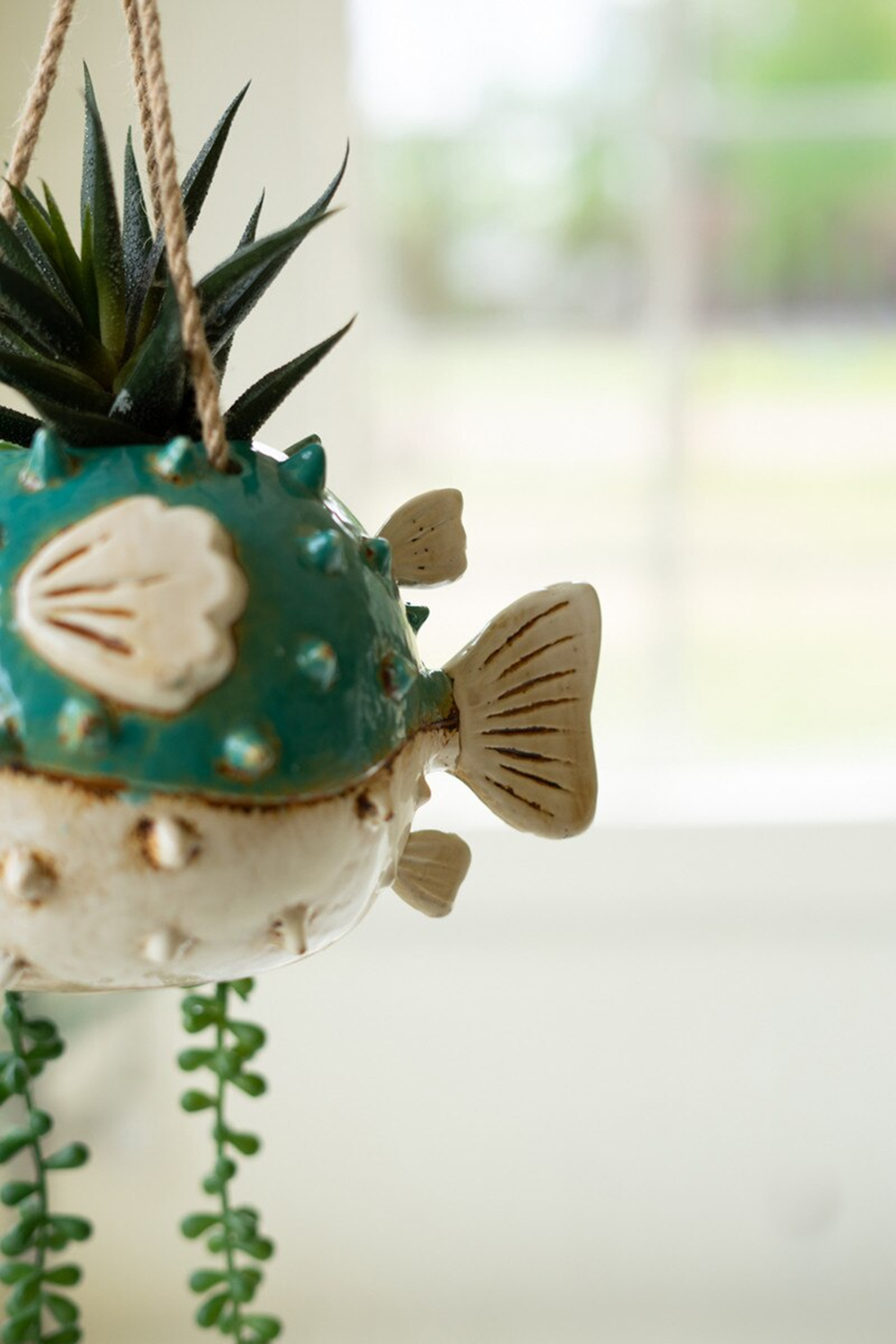 Add this hanging blowfish planter to your coastal collection or seaside retreat. This bumpy blowfish in teal, red, and white holds succulents and air plants suspended while adding a splash of colorful fun to your space. No drainage hole.