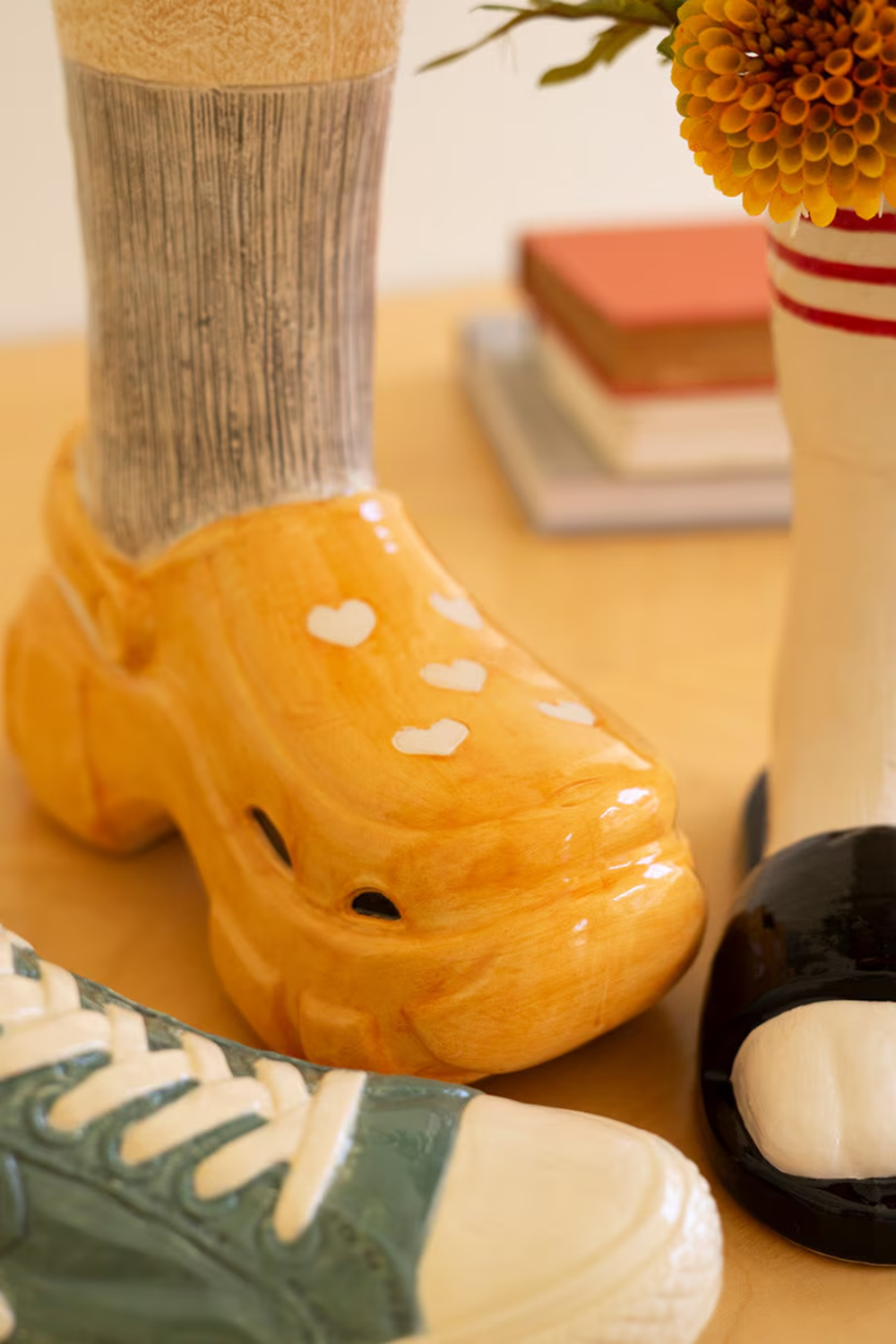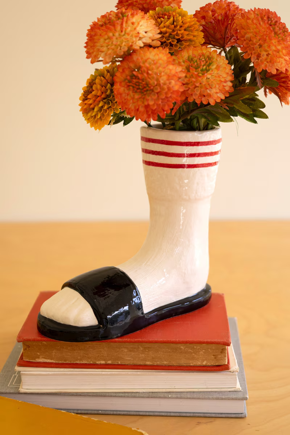 Cozy and charming, these Slides with Socks Vases are ready to kick back and relax with your florals. Their sweet shape adds a soft touch that feels right at home, making it the perfect piece for anyone who loves to put their best foot forward in decorating. Finished on all sides. No drain hole. Sold in a box of 2.