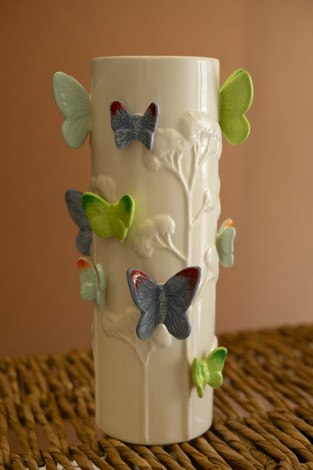 Flutter away. This ceramic butterfly vase is crawling with colorful butterflies. It's the perfect gift or touch for a feminine space. No drain hole. Hand wash with gentle detergent.