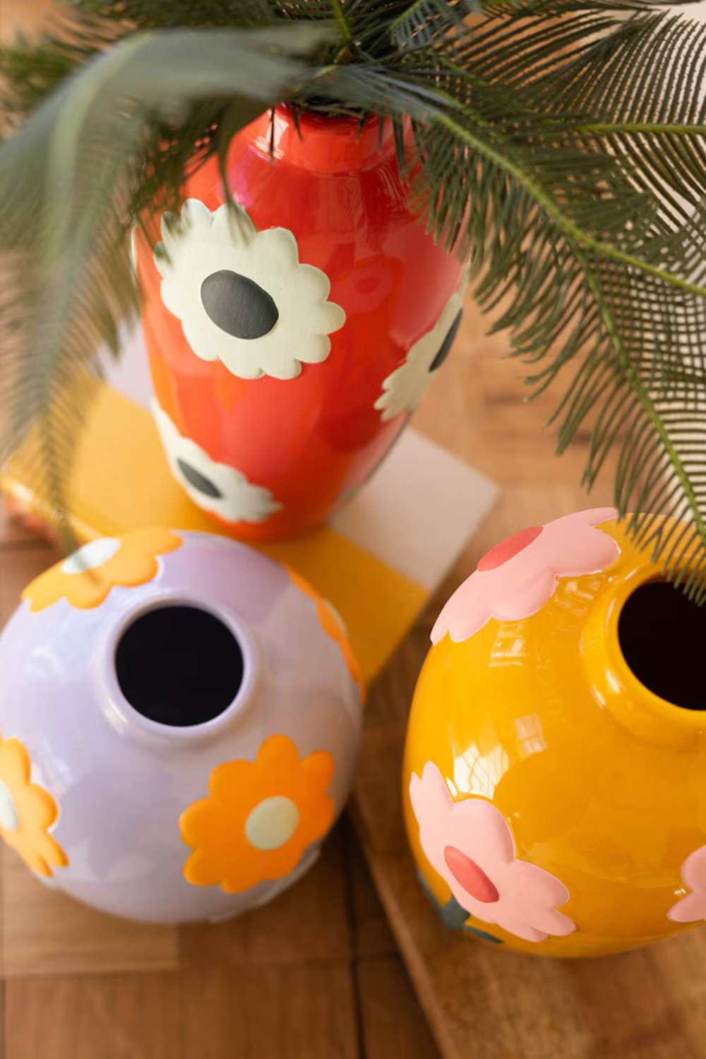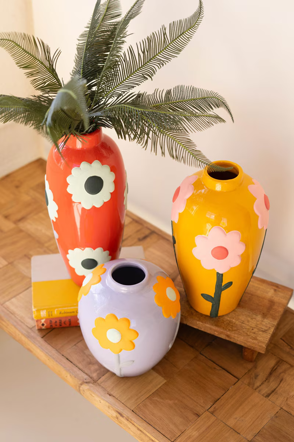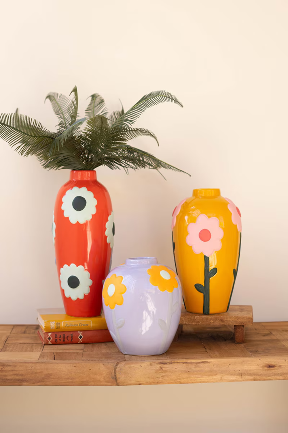 These charming little vases bloom with retro personality. Each one is topped with a cheerful flower in vintage inspired colors that feel straight out of a sunny seventies art print. Their playful shapes and bold tones make even the simplest stems feel extra groovy. A happy trio that brings a little throwback flair to any shelf or tabletop. Finished on all sides. Flowers are matte/unfinished. Set includes 3 pieces- one of each style.