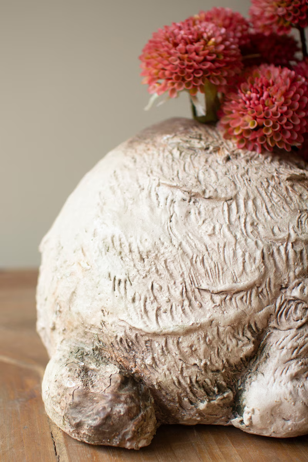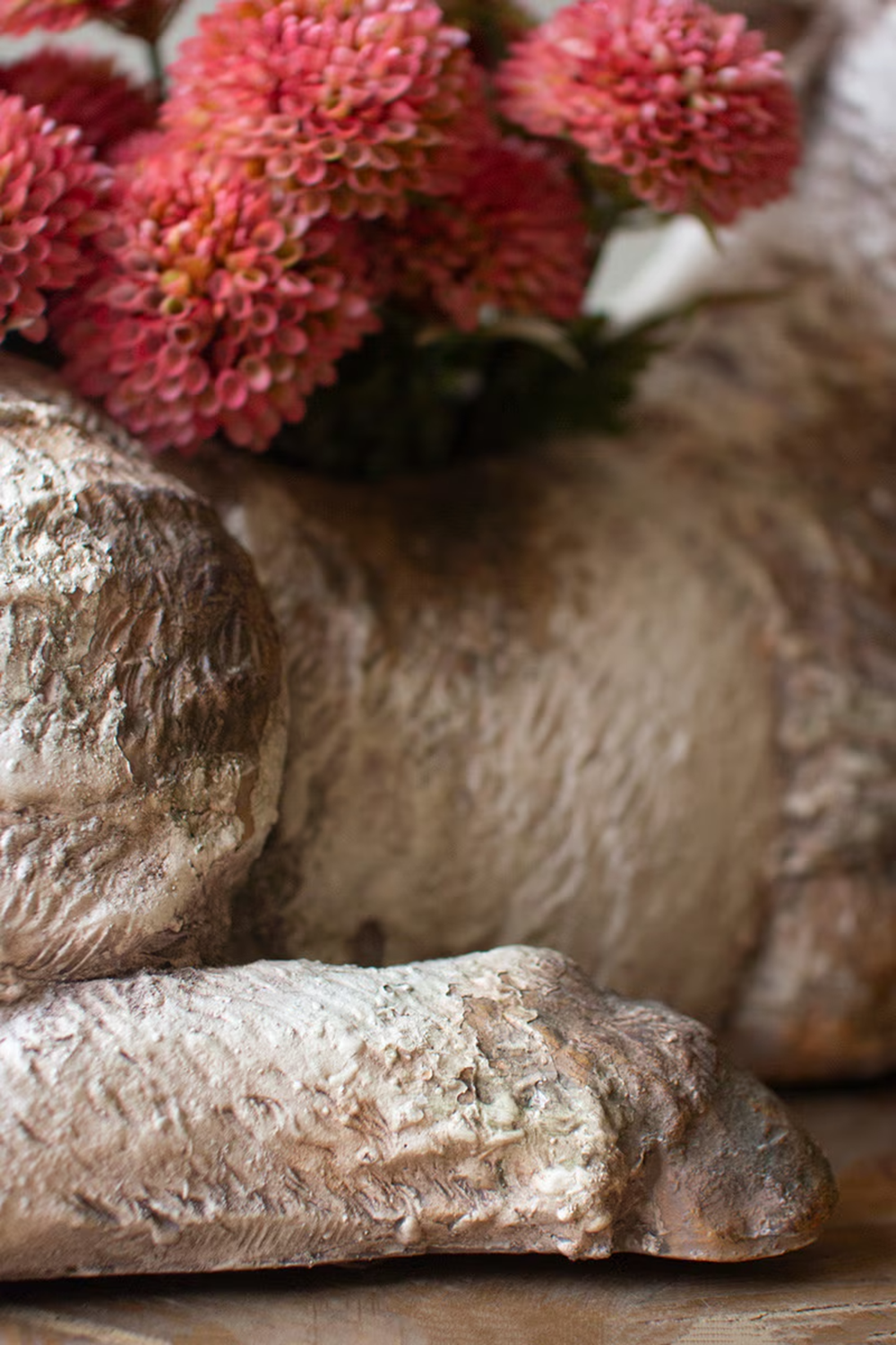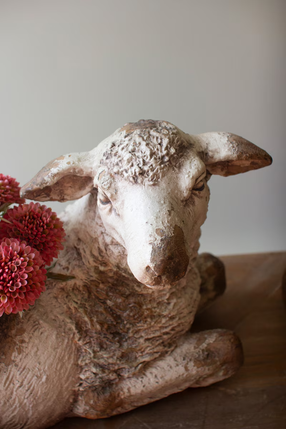 Crafted in a faux concrete finish, this sheep planter brings a calm, rustic charm to any space. The sculpted texture and soft, weathered tones give it the look of a piece discovered in a cottage garden. A roomy planting area makes it easy to fill with greenery or seasonal stems. Finished on all sides with a solid bottom and no drain hole, it is designed for effortless styling indoors or in covered outdoor spaces. This piece adds a gentle, pastoral touch wherever it is placed. Solid bottom. Finished all around. No drain hole. Do not expose to the elements. For indoor or covered outdoor use only.