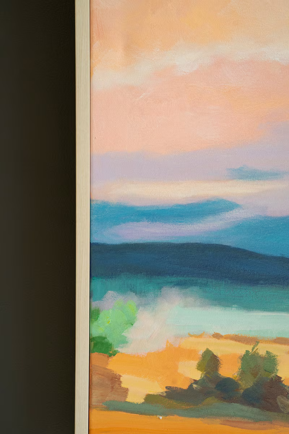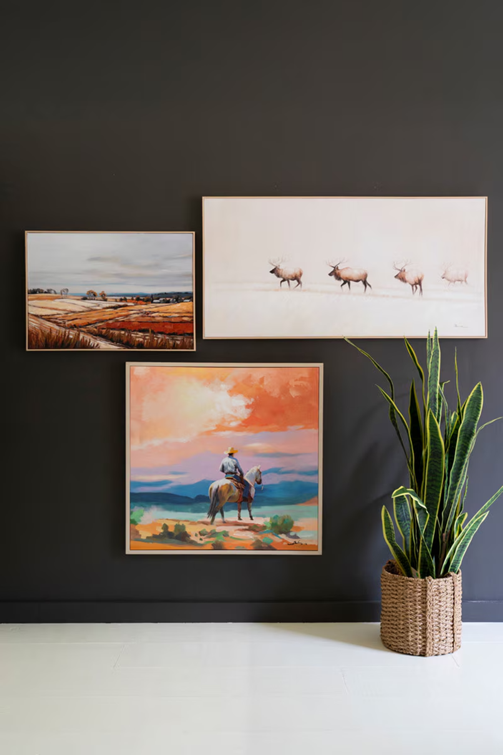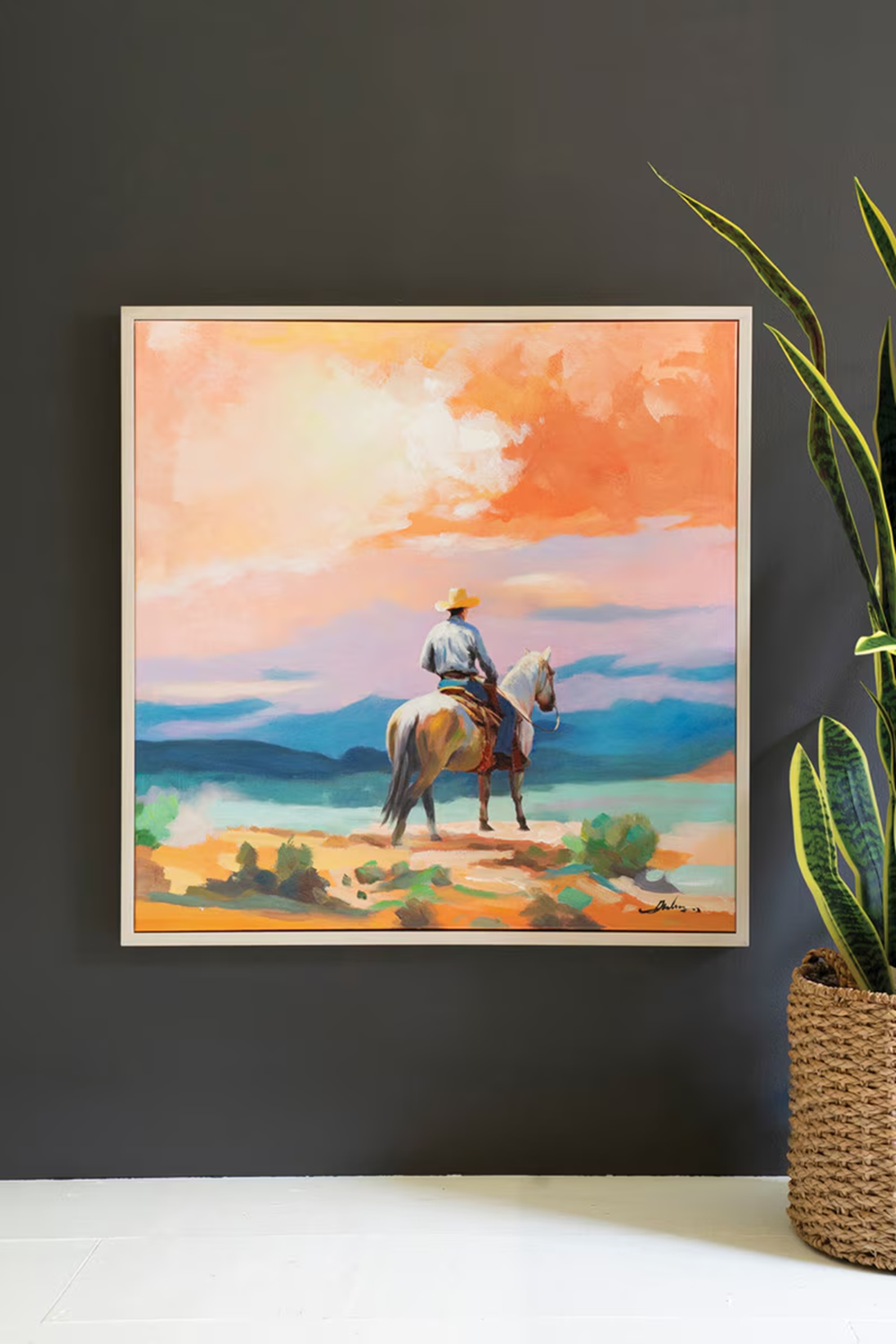 The bright Western landscape fills this framed acrylic painting. A Cowboy atop his horse gazes into the mountainous sunset. Great for a Western theme or any wall that needs a color lift! Two D-Ring hooks. Hardware included. (33.5" x 2" x 33.5"t)