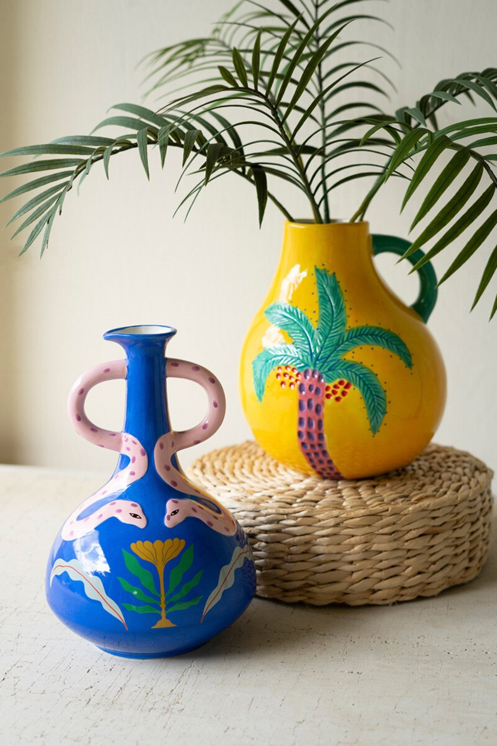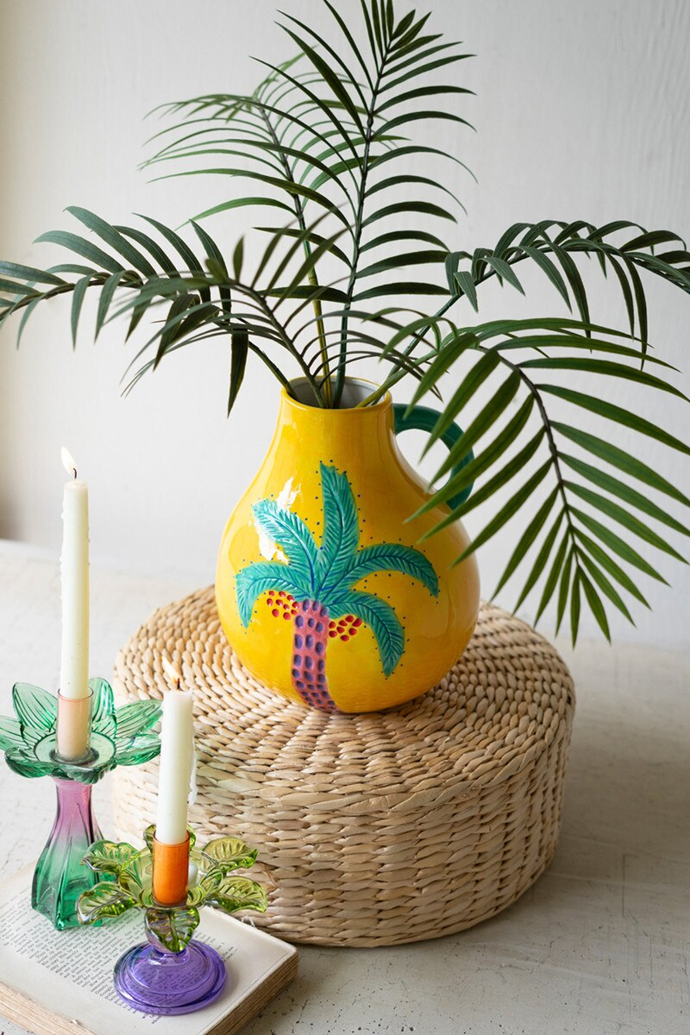 This yellow pitcher-style vase has a colorful palm tree painted on the side. Enjoy empty or full of your favorite botanicals. Add a bright spot to any corner with this bright vase!