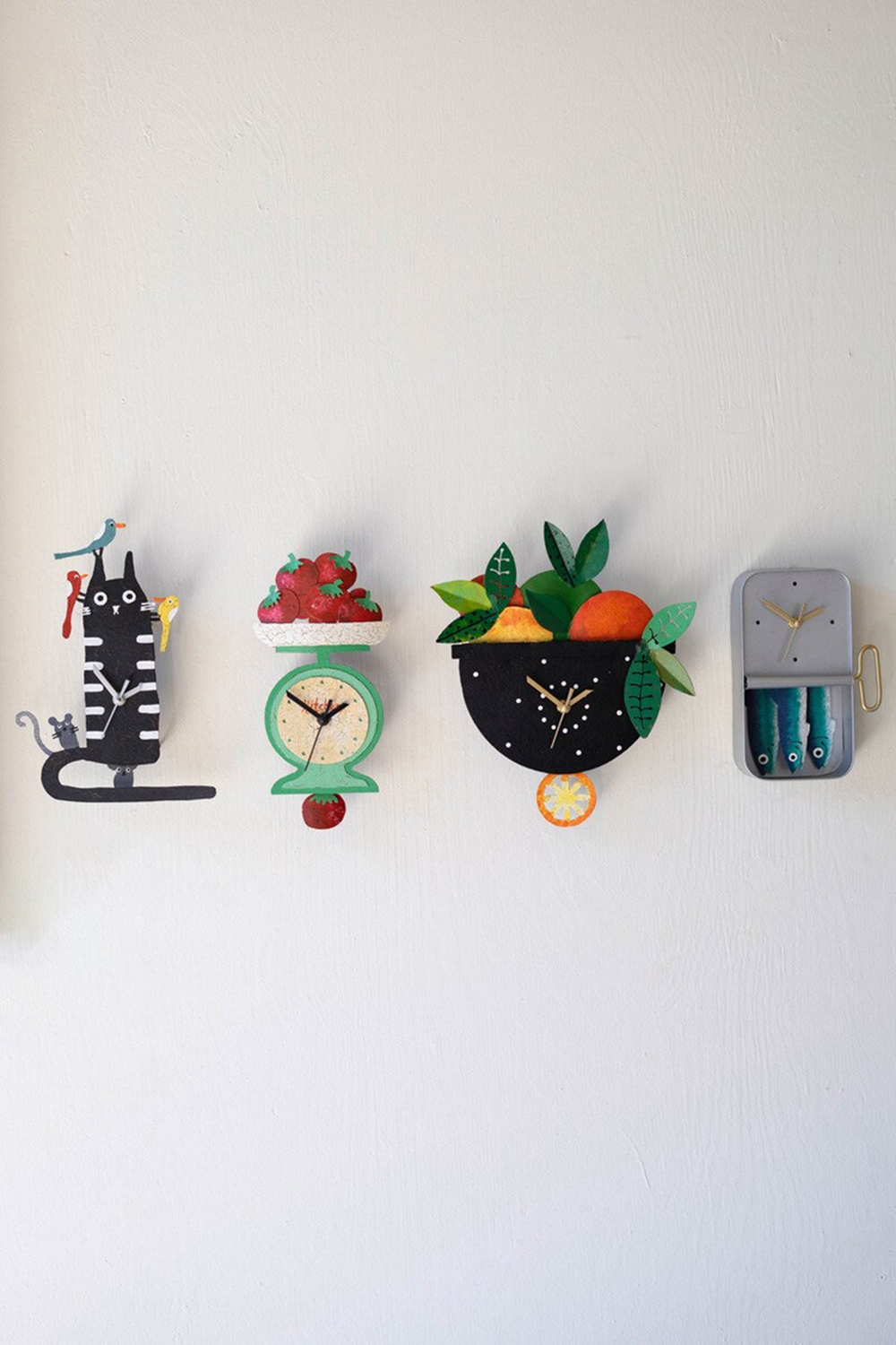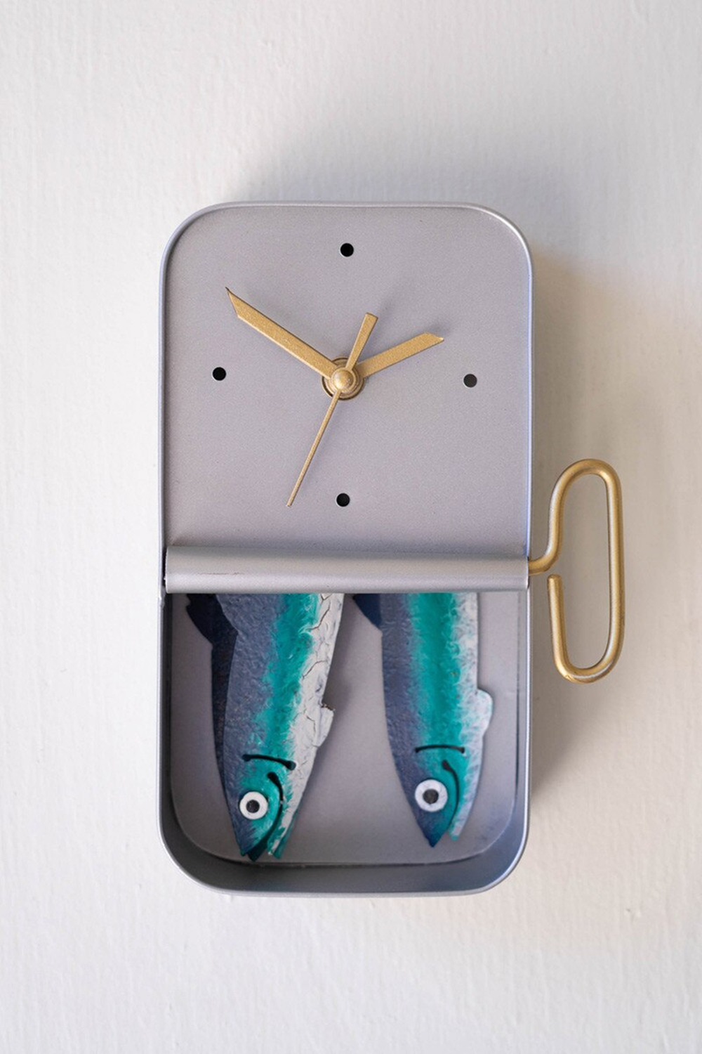 This anchovy tin clock brings a splash of culinary, seaside whimsy to your wall. With its bright little fish and playful tin can design, it keeps time with a wink and a wave. A fun pick for kitchens or any space that could use a bit of nautical charm. (6" x 2" x 9"t)