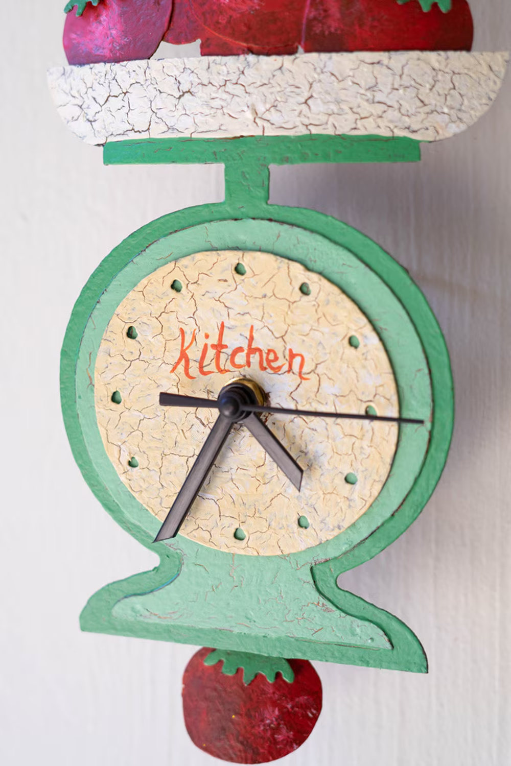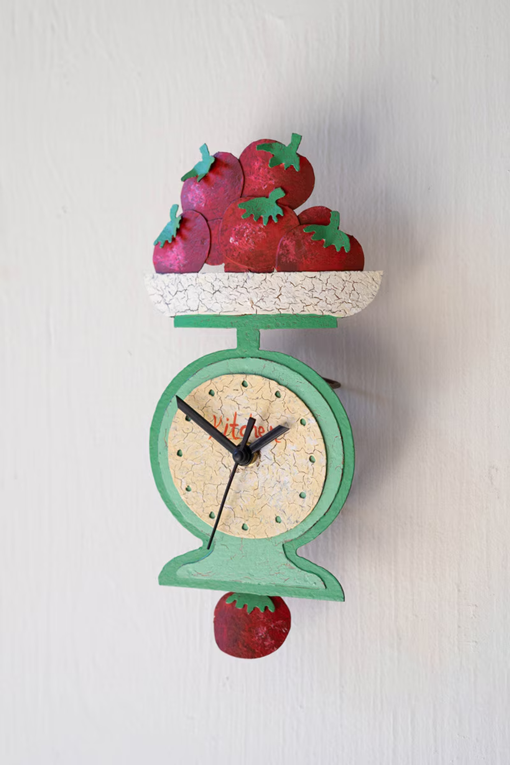 This charming clock pairs bright tomatoes with a vintage style scale for a cheerful kitchen accent. The hand painted details and soft colors make it feel fresh and nostalgic all at once. A delightful way to keep track of time while adding a little charm. Requires 1 AA battery (not included). (5" x 2" x 11"t)