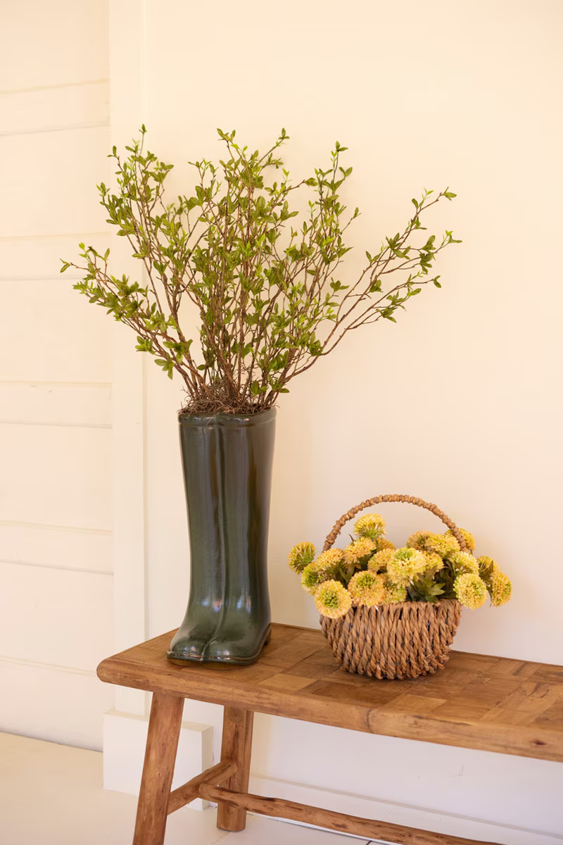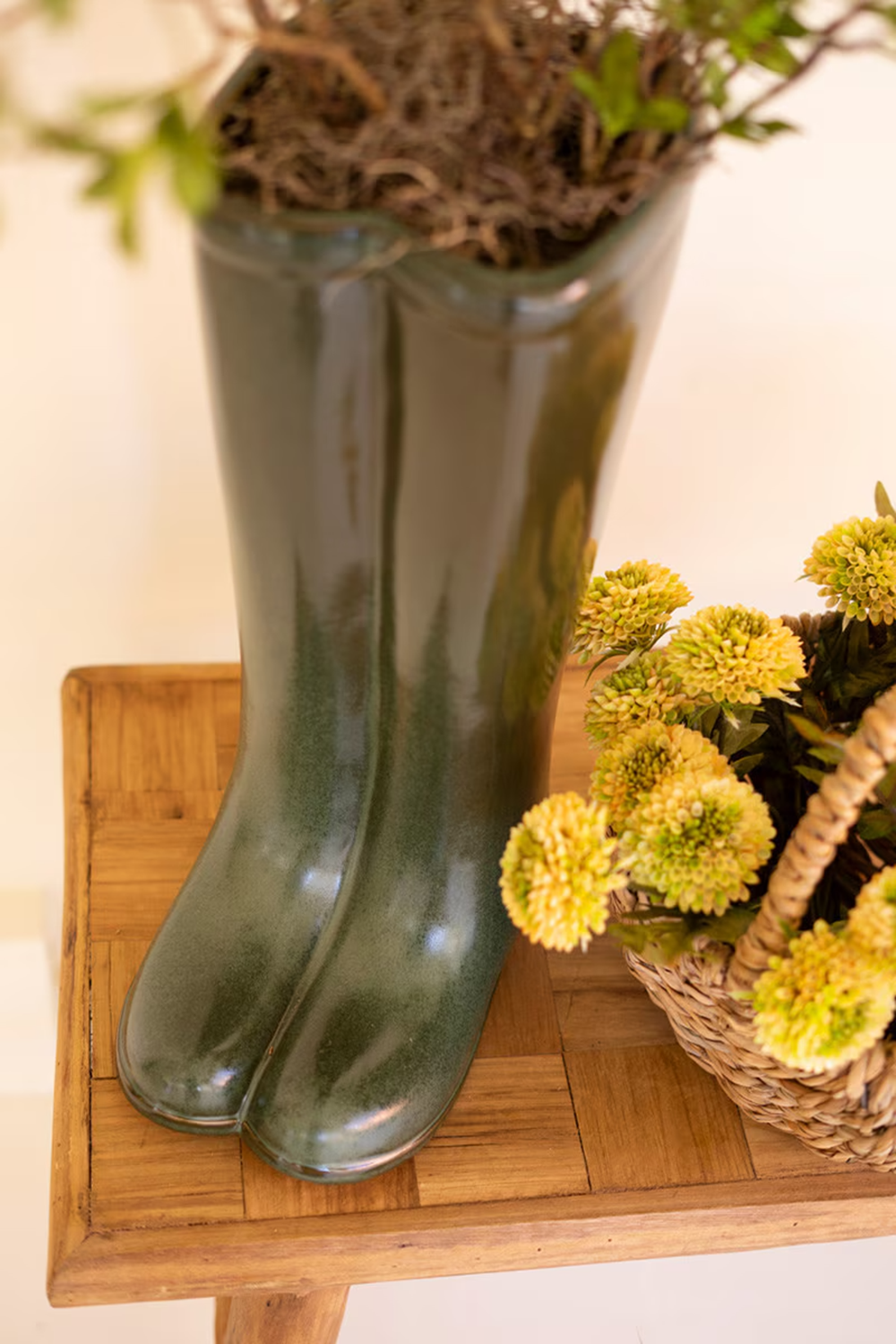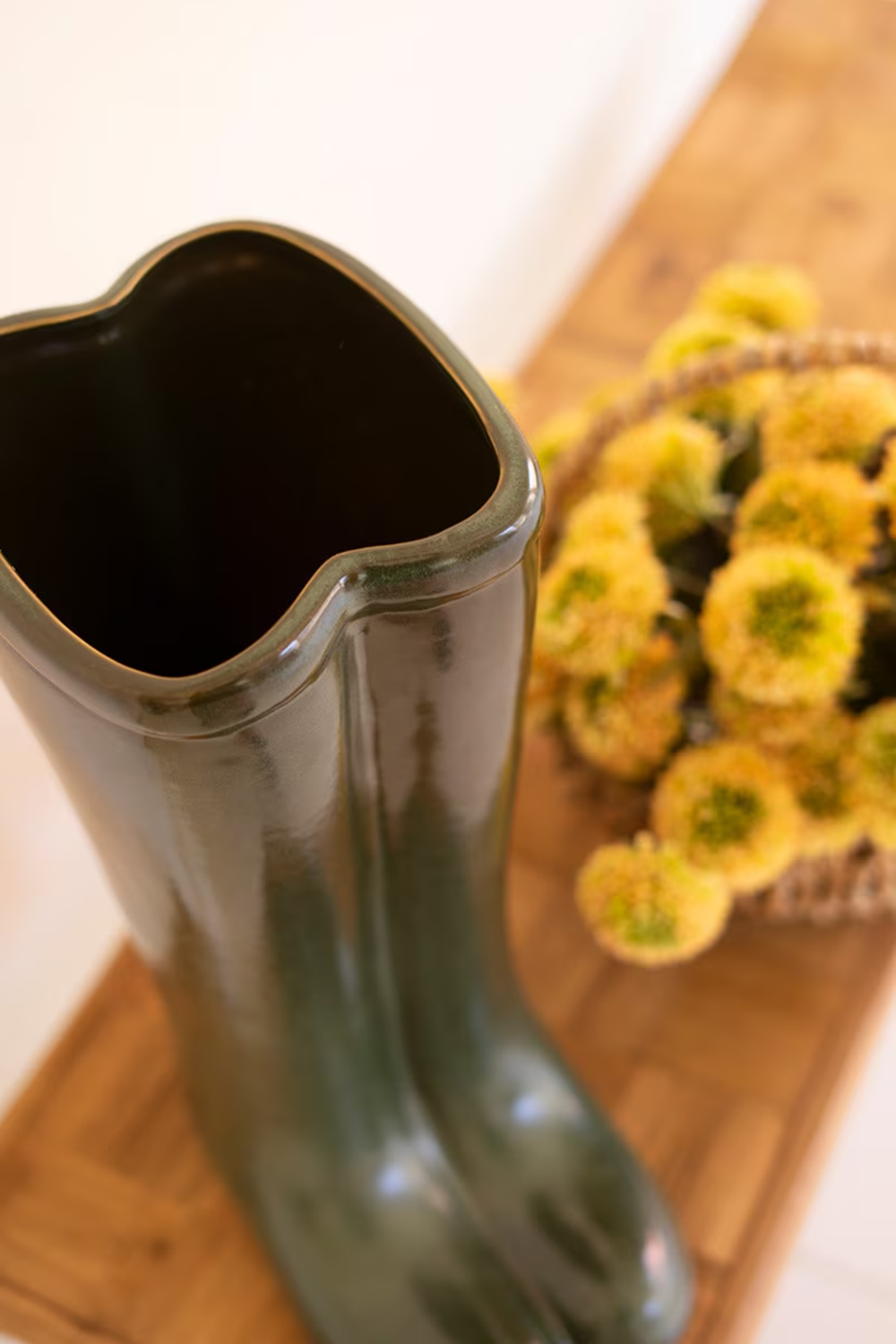 Full of charm and character, this ceramic boot vase puts a playful twist on floral styling. The glossy glaze and tall shape make it just right for stems with height, while the classic boot form adds a fun nod to an English country garden. Whether filled with greenery or left empty as a statement piece, it brings a spirited touch to any room! Finished on all sides. Rubber feet. No drain hole.