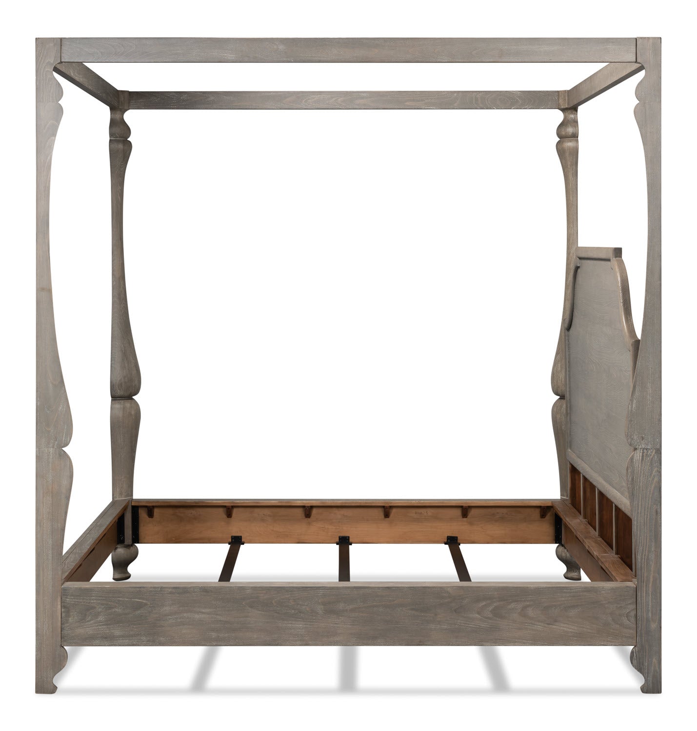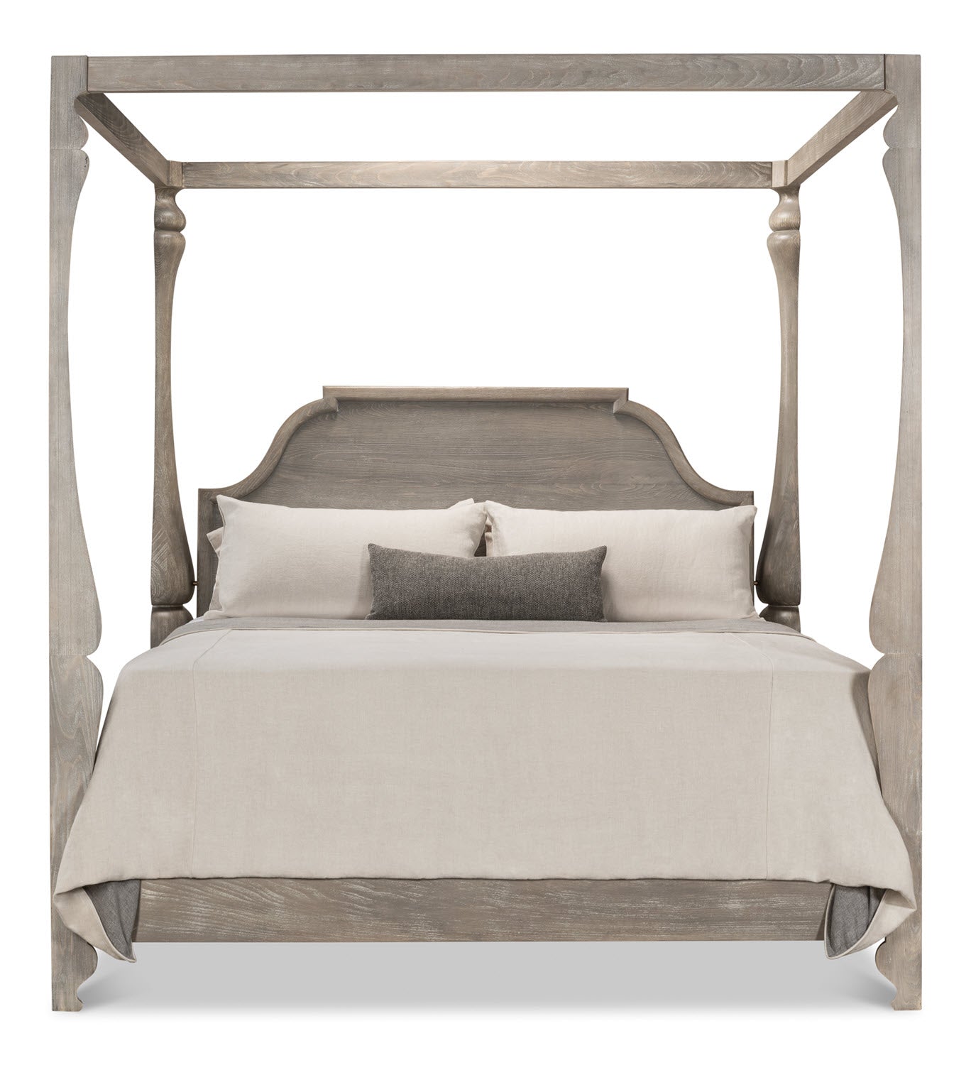 Simple, yet sophisticated, this poster bed has a unique round post that has been quartered to expose flat sides and is set apart with a headboard veneered in pine and framed in softly crowned molding. It looks extra fresh crafted in Beechwood with a Moon Skin finish, accented with iron and brass. Assembly required.