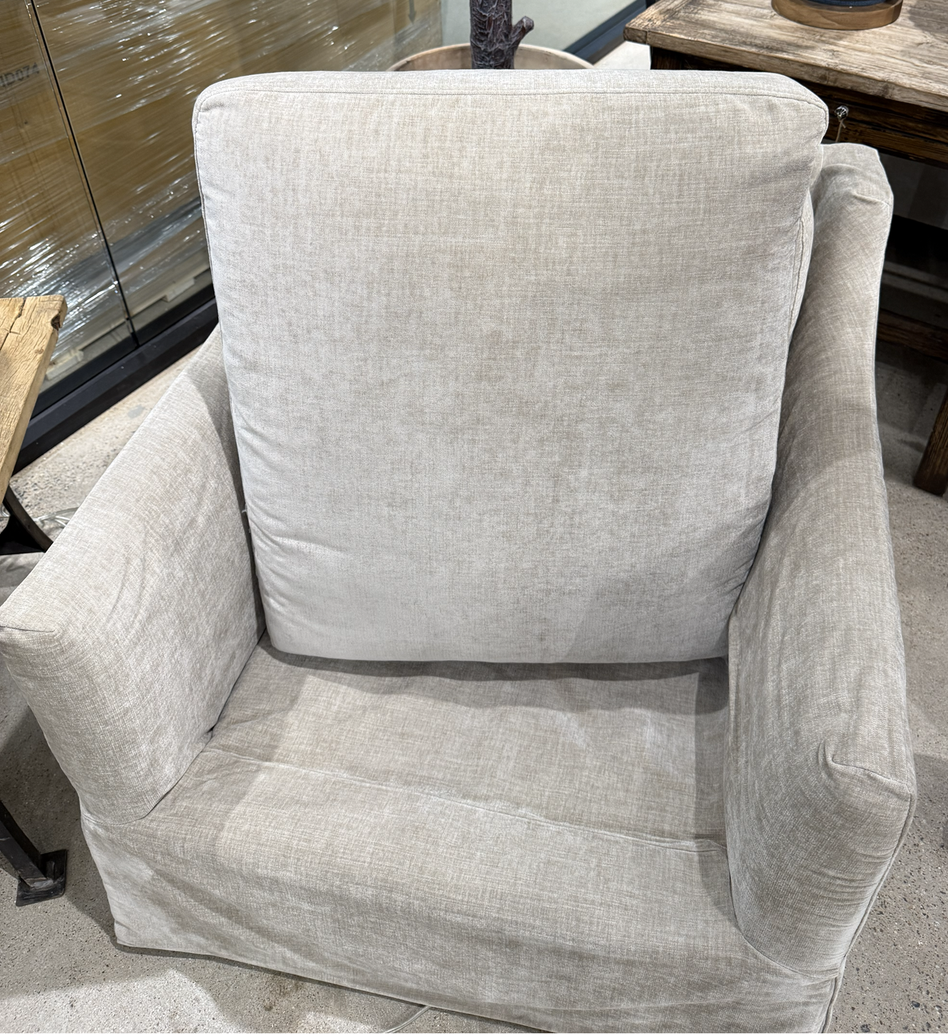 New from Porch View Home! This great Madeline Swivel Chair features a slipcover and beautiful vintage velvet in a neutral color. The seat cushion can be flipped if necessary as you can see in the last photo from the showroom.
