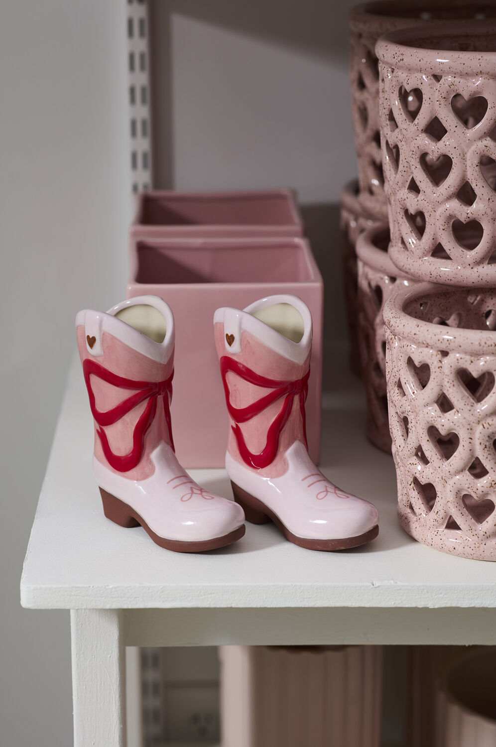 Boots and bows are having a moment, and this vase is here for both. The Rodeo Romance Vase features a cowgirl boot silhouette, red and pink glaze with hand painted details, a big red bow across the front, and a glossy finish, except for the natural textured terracotta sole. Perfect for Valentine's Day florals or as a desk accessory for home and gift customers, this boot is both trend-forward and functional. Sold as a set of 2.