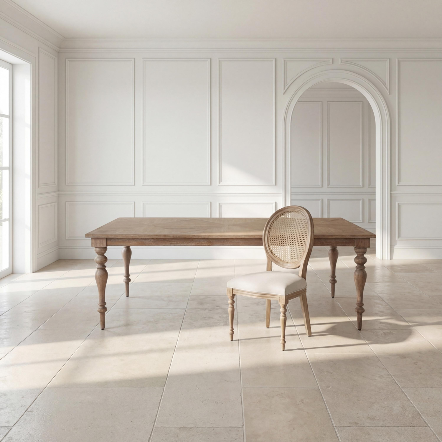 The Cotswold Dining Table draws its inspiration from the enduring charm of English country estates and the timeless artistry of parquetry design. Its intricate veneer top references the parquet floor patterns found in historic manors and châteaux, lending a layer of quiet sophistication to the table’s relaxed form. Beneath the richly detailed top, gracefully turned legs reflect 18th-century French and English design traditions, balancing sculptural presence with an inviting sense of ease. The result is a dining table that feels equally at home in a sunlit country dining room or a more formal estate setting. Comfortably seats eight.