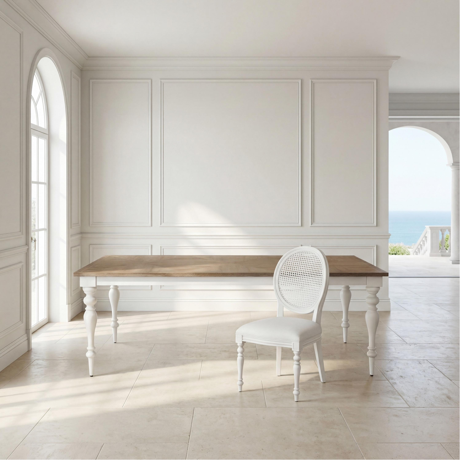 The Cotswold Dining Table draws its inspiration from the enduring charm of English country estates and the timeless artistry of parquetry design. Its intricate veneer top references the parquet floor patterns found in historic manors and châteaux, lending a layer of quiet sophistication to the table’s relaxed form. Beneath the richly detailed top, gracefully turned legs reflect 18th-century French and English design traditions, balancing sculptural presence with an inviting sense of ease. The result is a dining table that feels equally at home in a sunlit country dining room or a more formal estate setting. Comfortably seats eight.