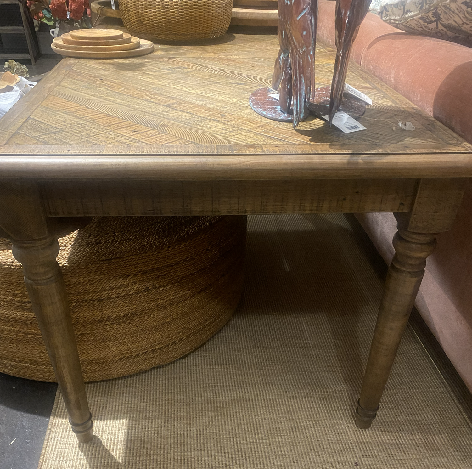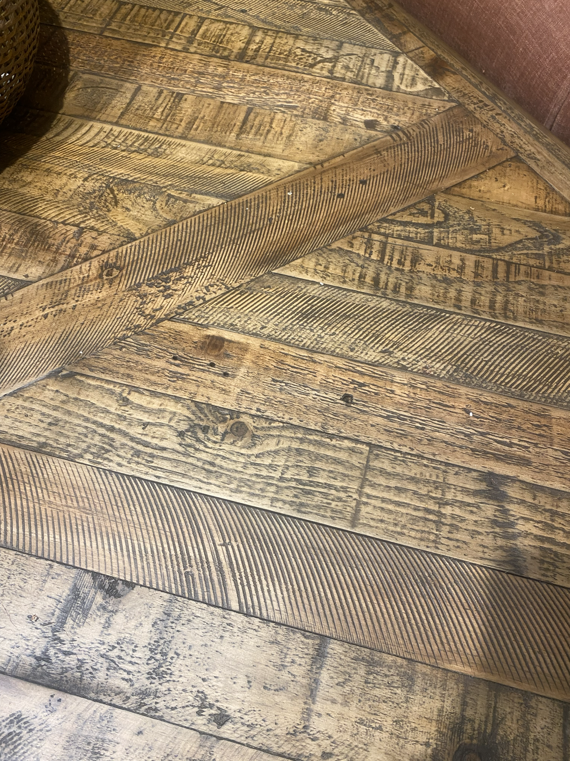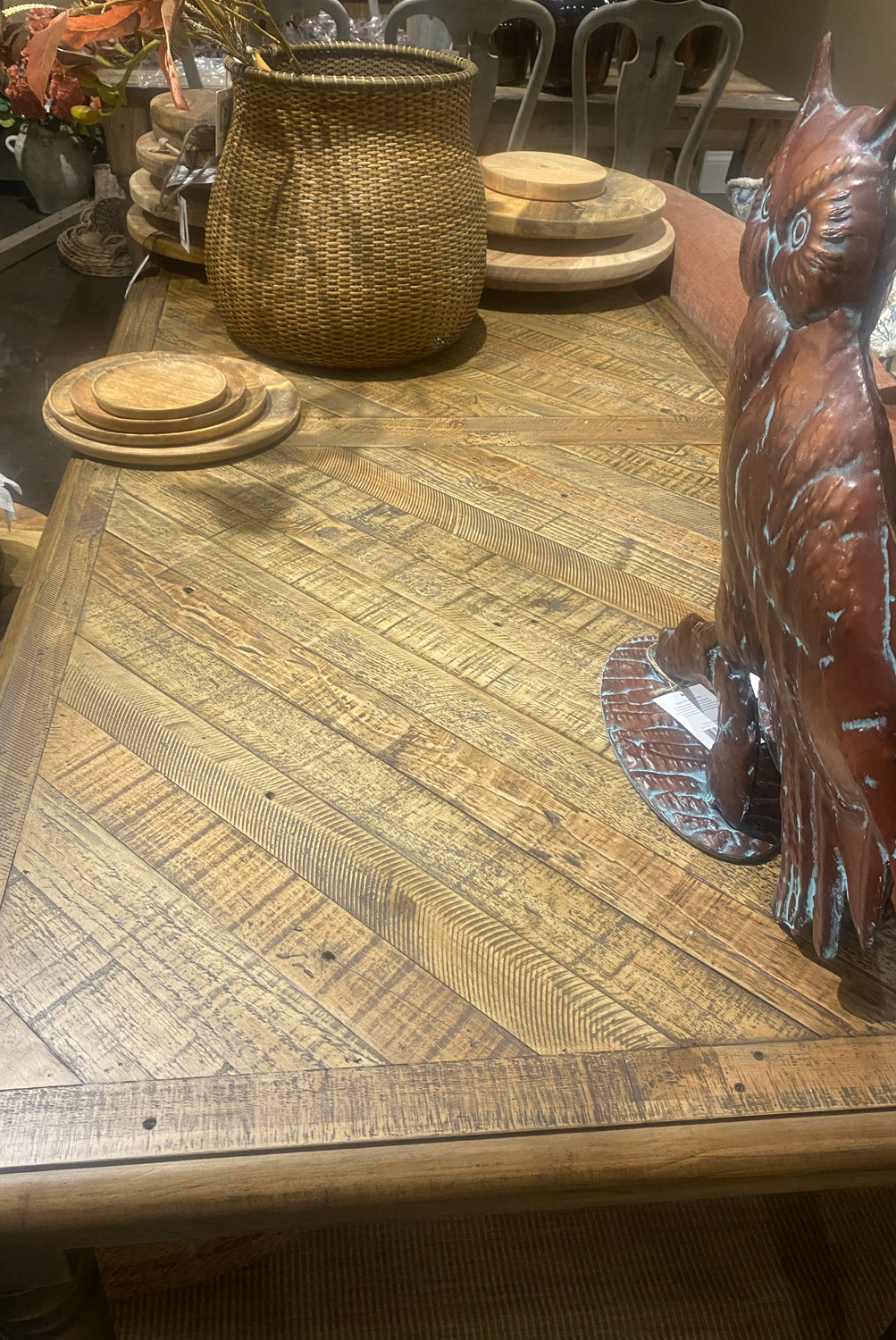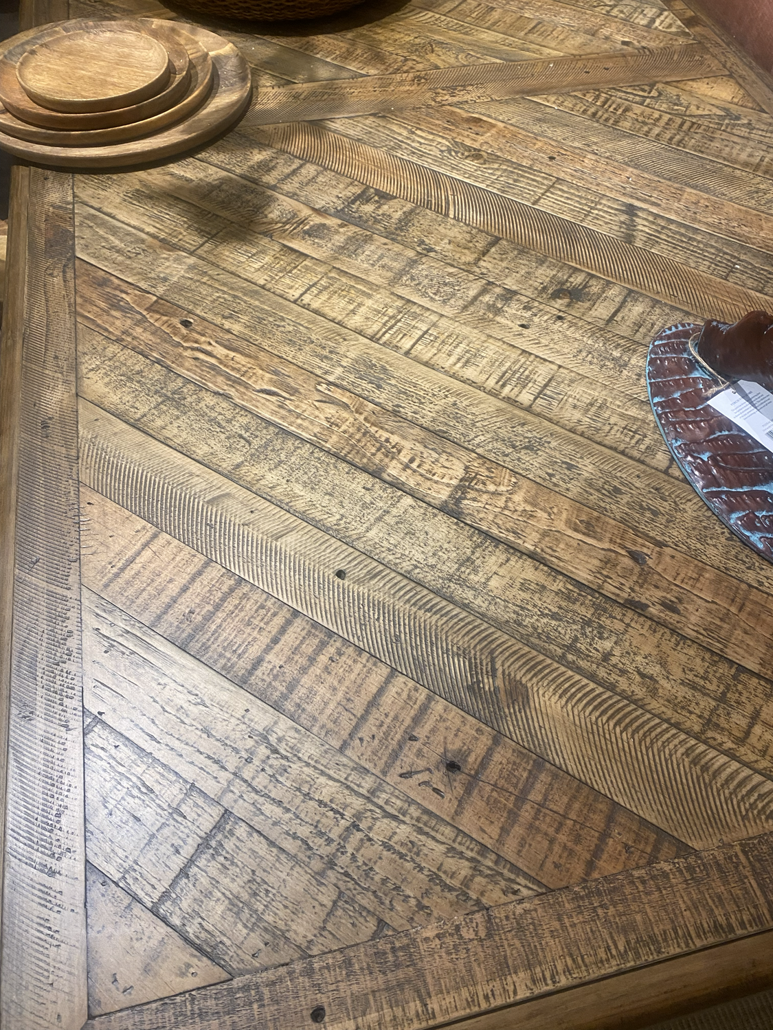 New from Porch View Home! The diagonal patterned top of this gorgeous reclaimed pine dining table is almost too pretty to cover up with dinnerware! We have added some close up pics of the top from the showroom to give a better look at the finish.