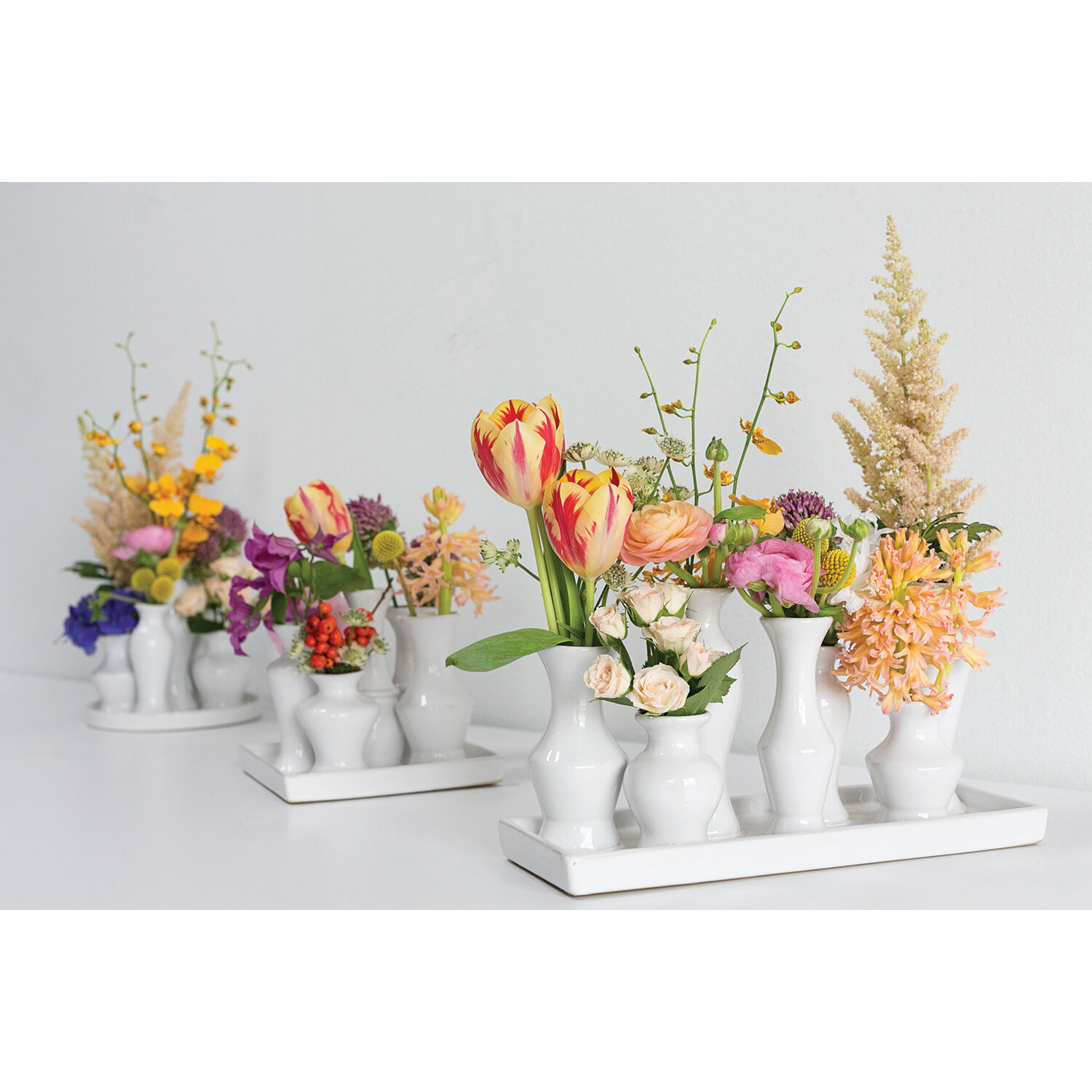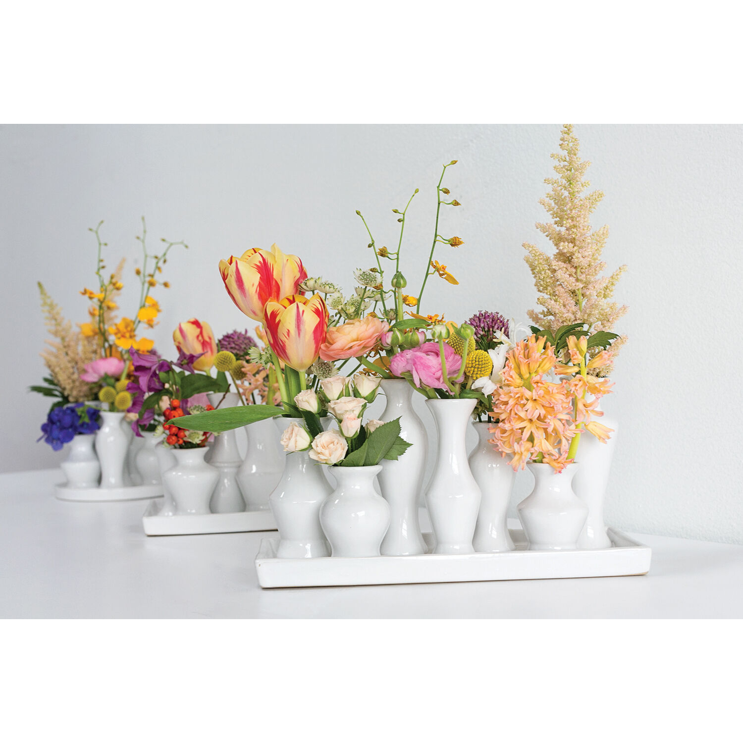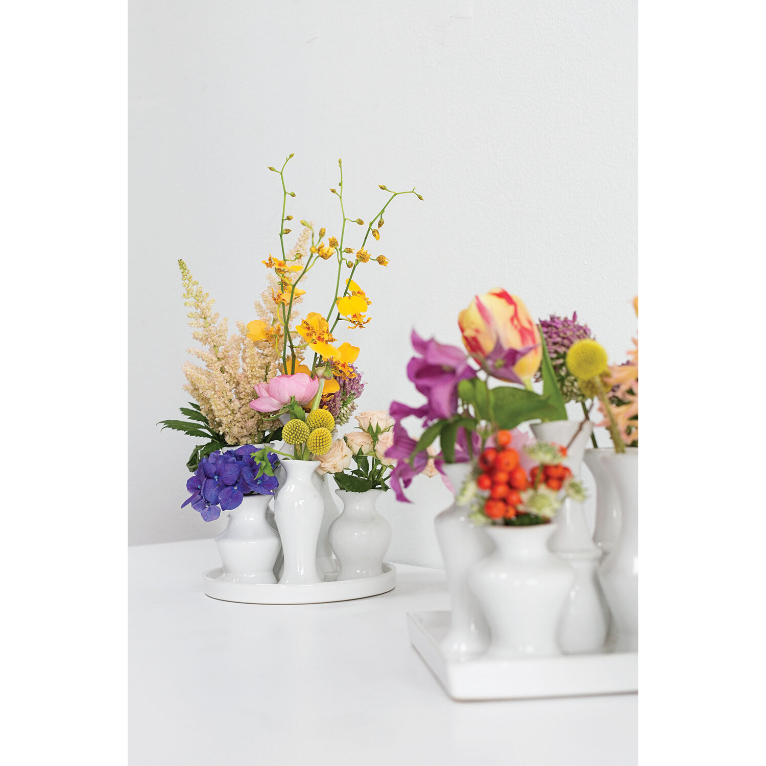 With the Chic Budvase Collection, the name speaks for itself and the style stands out on its own, with or without stems. Featuring unique ceramic budvases in varying heights and styles attached to a tray, these watertight pieces with a glossy white finish bring dimension and playfulness to everyday or event tabletop centerpieces.