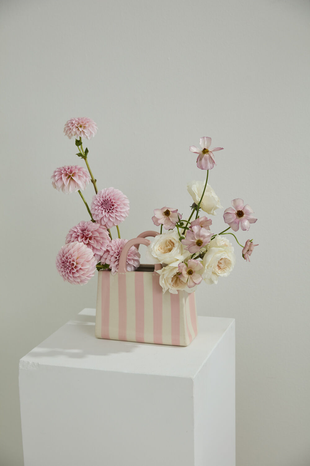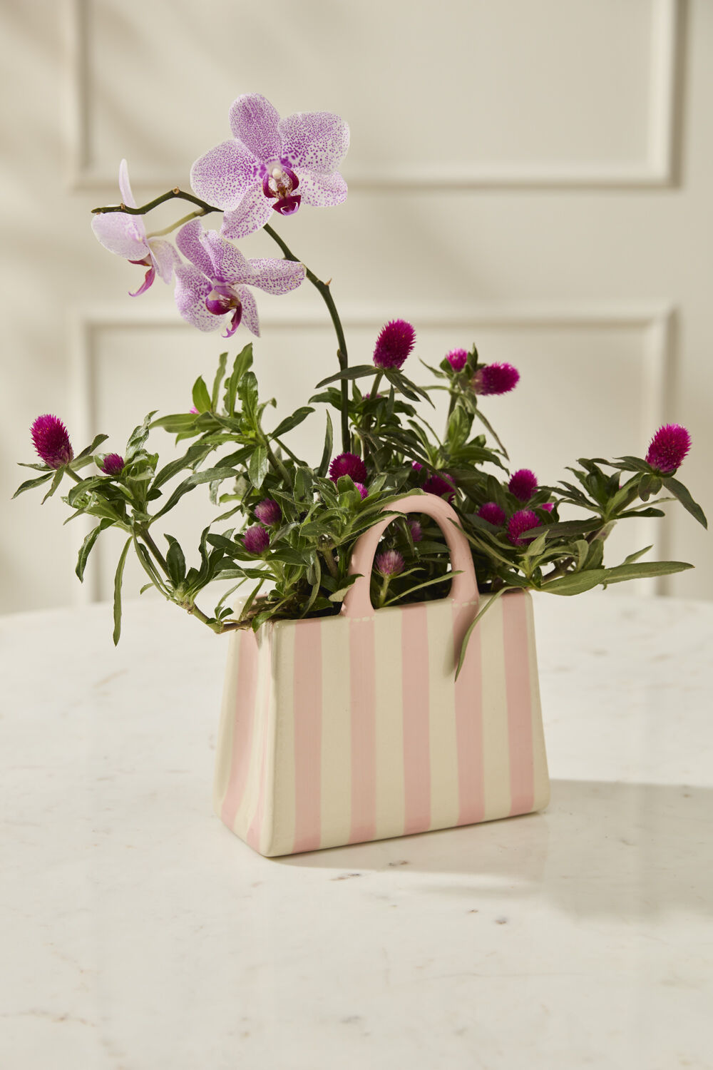 You haven't seen a vessel quite like the Miranda Handbag Vase, perfect for a Mother's Day or birthday gift paired with lush, overflowing florals. This ceramic tote bag features white and pink vertical stripes, a glossy finish, and upright handles. The size, shape, and flat sturdy base allow for easy floral transport and delivery and the Miranda is versatile for repurposing as a fun display in the home!