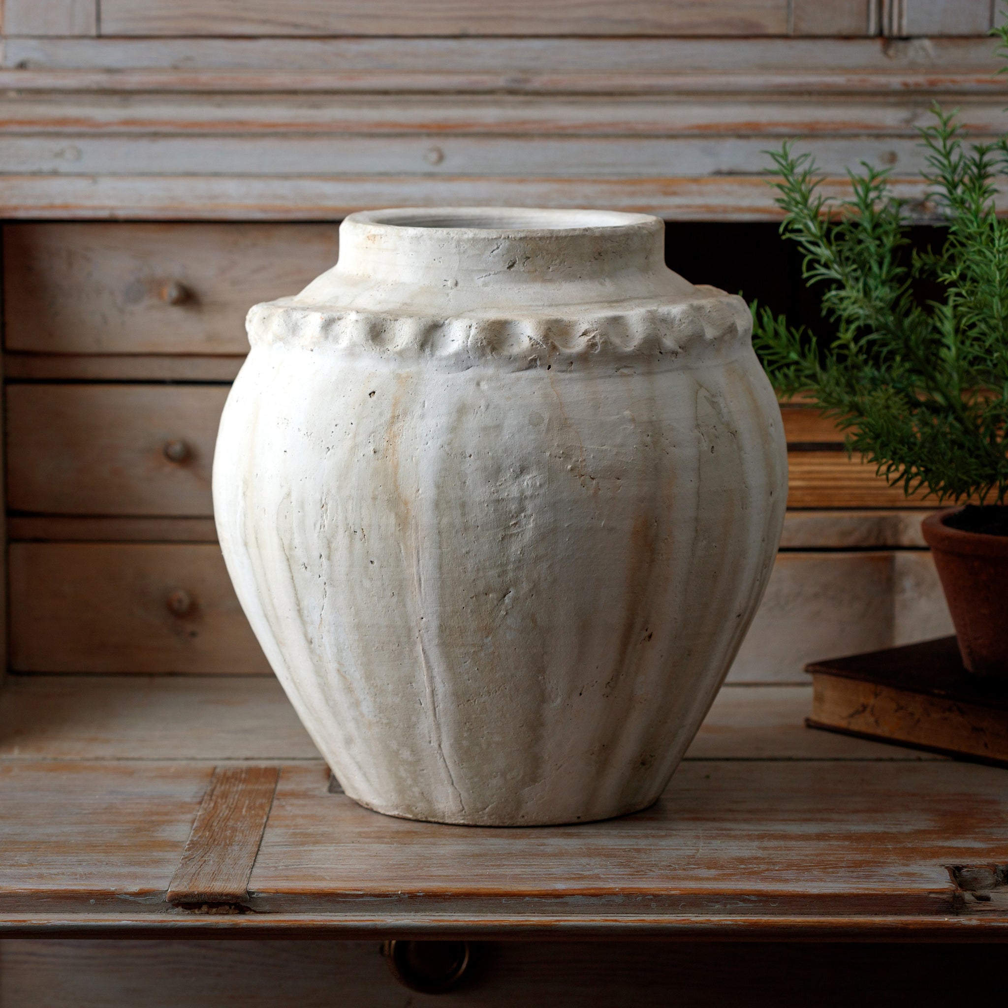 We love the rounded shape of this great Veranda Pot from Porch View Home with its natural looking white-washed feel and chunky fluted trim around the top! Lovely displayed on its own or filled with some of your favorite faux stems.