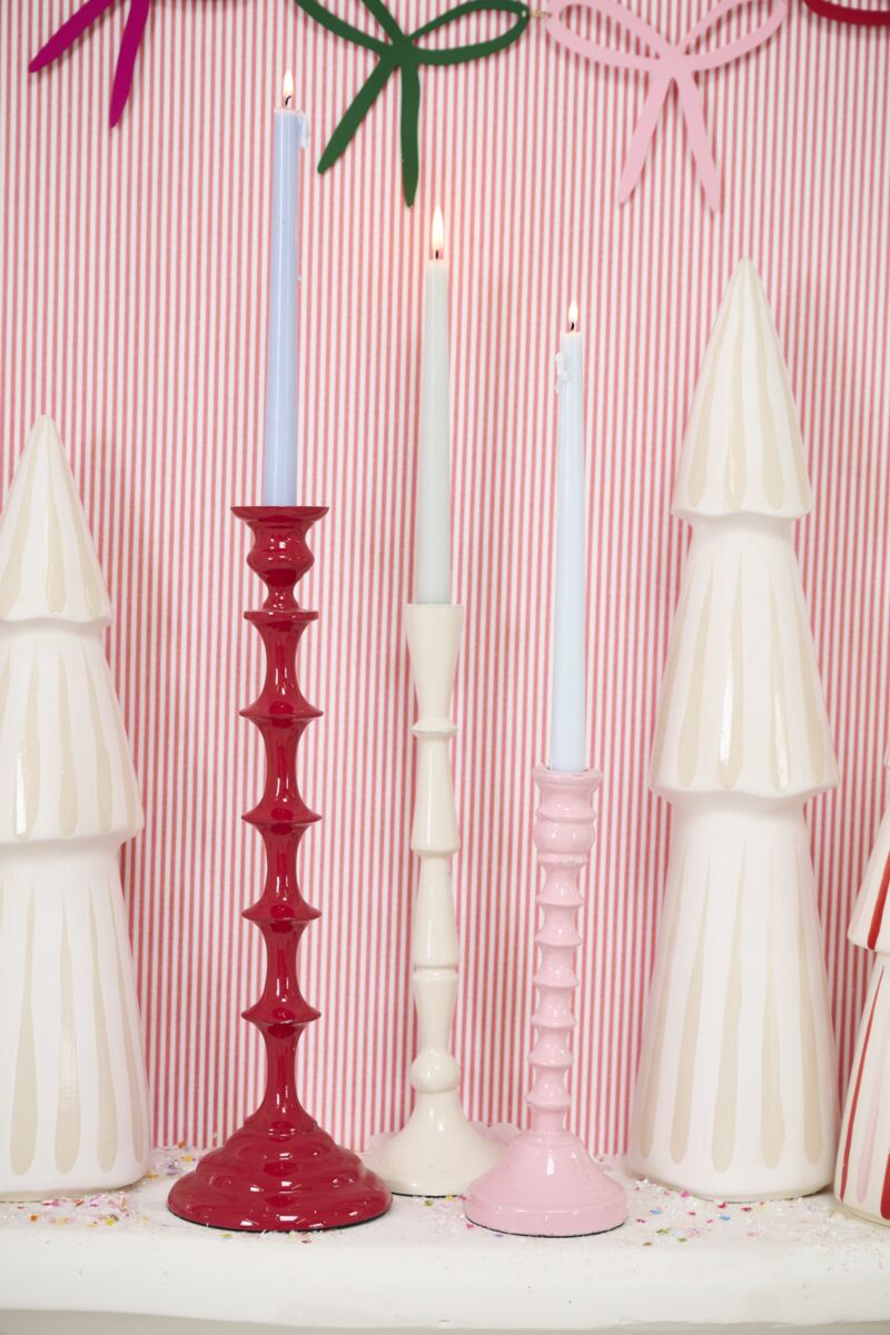 Sprinkle some color on the holiday mantel or dessert table with these beautiful Candy Coated Candleholders, weighted metal taper holders in bright red, white, and pink. With glossy, smooth finishes, these classic stacked curving silhouettes feel fresh and unique for the holidays. Sold individually.