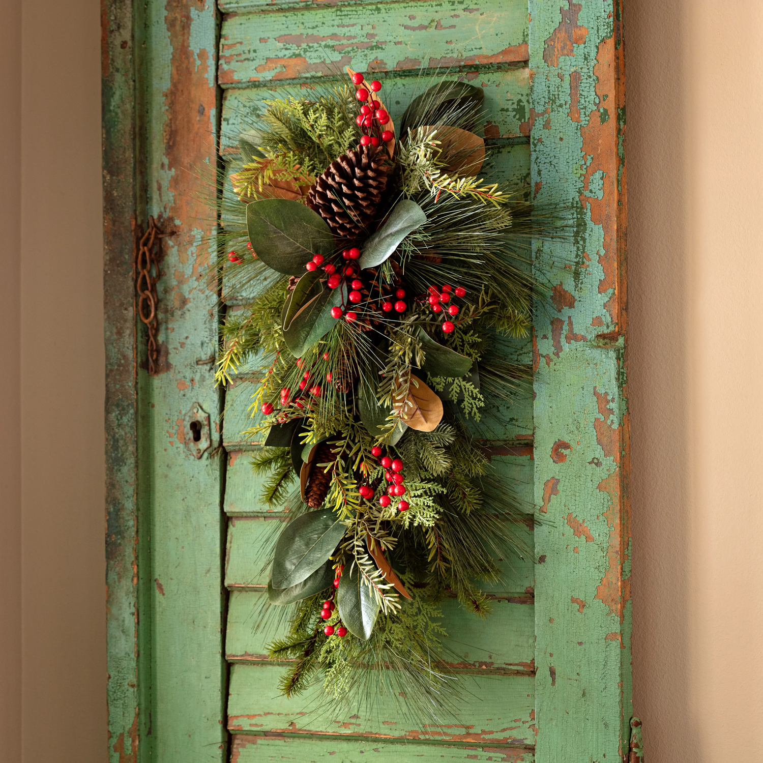 Usher in the season with these Christmas Celebration Swags featuring beautiful greenery, magnolia leaves, pinecones, and berries! From Porch View Home's Holiday Collection. Sold as a set of two swags.