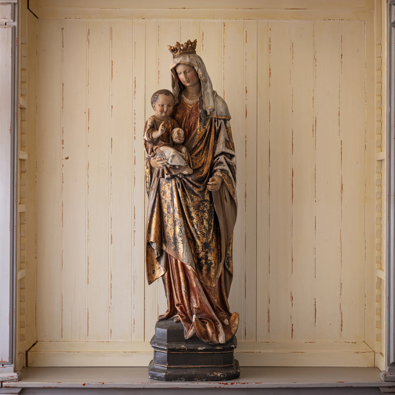 This dramatic freestanding statue of Madonna and Child is artfully painted and gilded by gifted artisans. The finish reflects the work of European masters who devoted a lifetime to their craft making this statue divine. From Porch View Home's Holiday Collection.