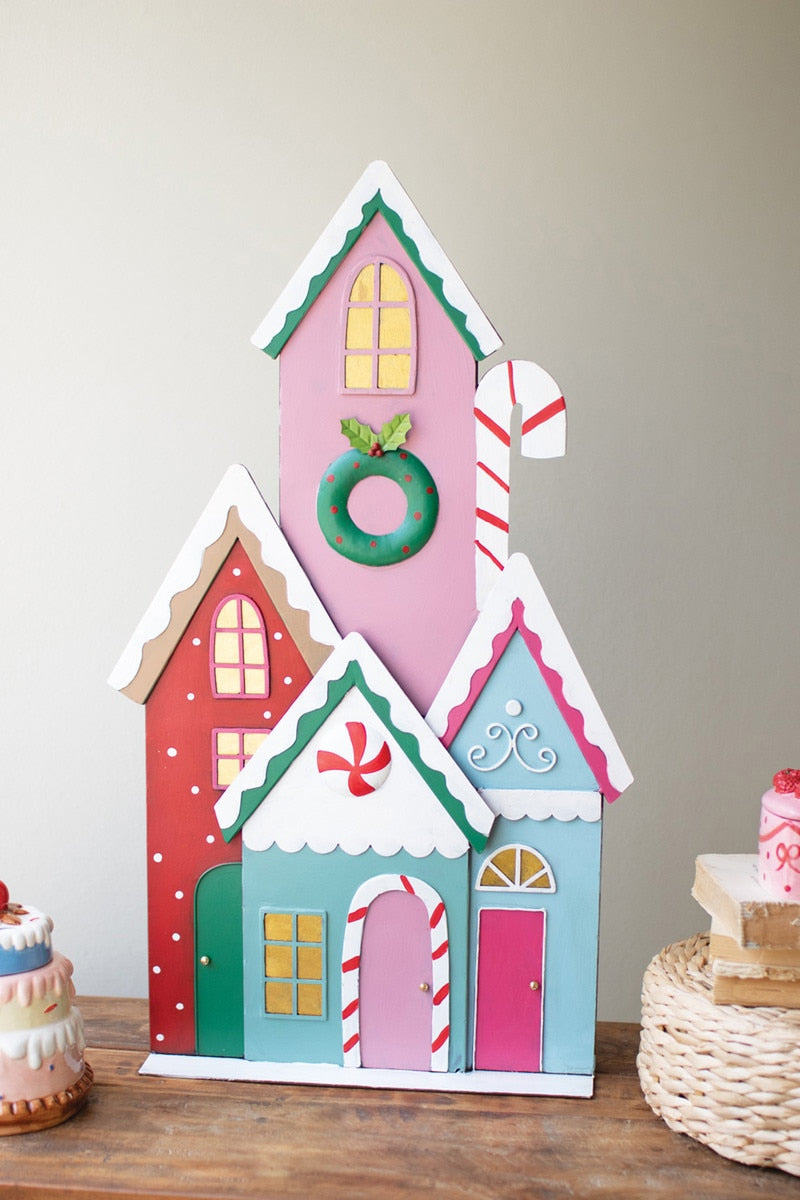 This painted metal Christmas village has everything in one. Houses huddle close to make up this brightly colored village. Add some trees for a perfect holiday setup. Finished on one side. Deterioration may occur if exposed to the elements. Applying a clear coat may extend the life of the product.