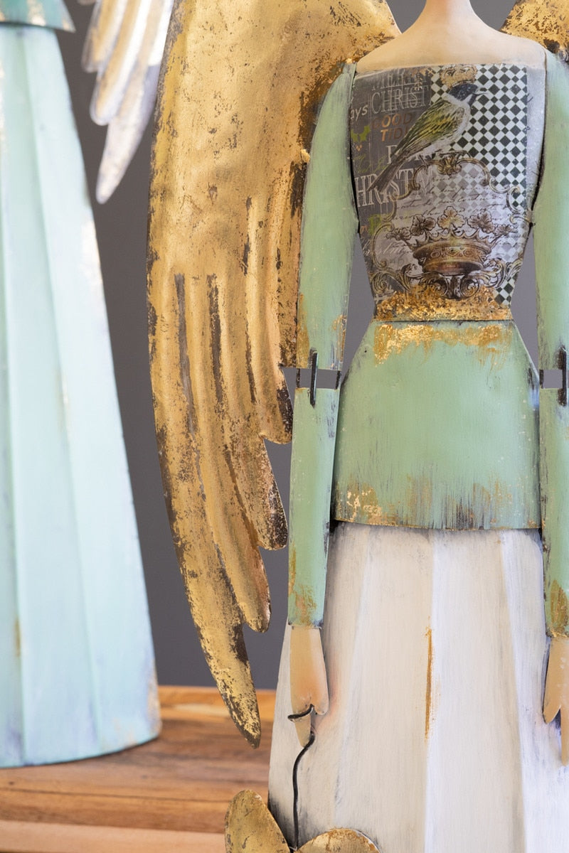 Hark! These crowned heavenly hosts in green and white, one with folded hands, the other holding a golden heart, make perfect holiday decor or a special gift. This pair of painted metal angels will watch over your entryway or keep Santa company. Set includes 2 pieces.