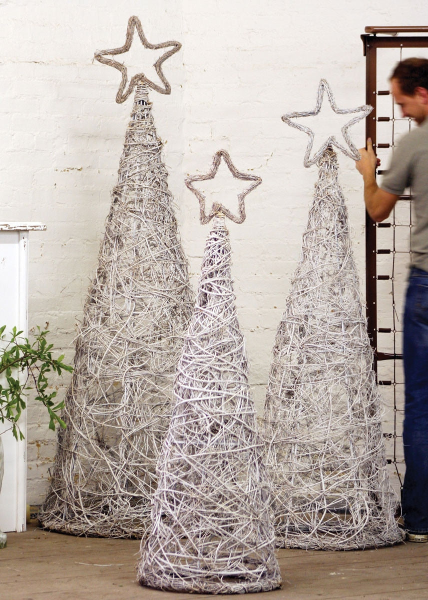 Your natural winter season will look extra special this year with our set of three whitewash giant iron twig topiaries with star finials. Its organic charm will make a visual impact. Great to place in a home or in a covered area. Handcrafted by skilled artisans in Haiti. Set includes 3 pieces. Indoor use.