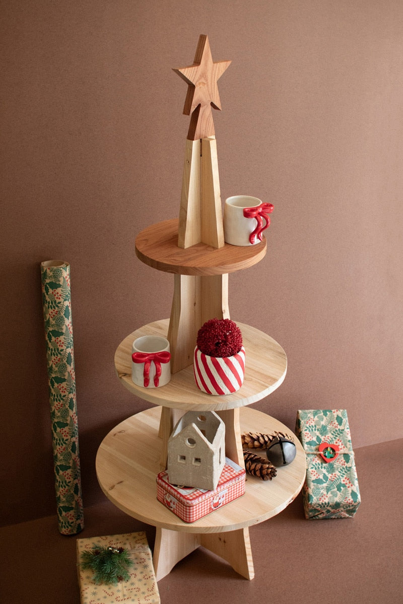 Need a new present idea? How about filling one of these wooden Christmas tree shelves? With plenty of perches for small gifts or treasures, this three-tiered tree pulls double duty. Finished front and back. Some assembly required.